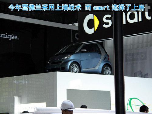 為了吸引觀眾的眼球,各個(gè)廠商也費(fèi)勁了心思布展,雪佛蘭看上了歷年MINI的絕招,就是把車(chē)掛在墻上,而Smart則直接將車(chē)擺上了房頂。這使我不得不去聯(lián)想下屆車(chē)展會(huì)不會(huì)倒掛在房頂上?車(chē)展吸引人的地方有很多,其中就包括我們?cè)谶@里可以親眼看到一些神車(chē),例如我們眼前的尚酷R,這個(gè)版本在中國(guó)來(lái)說(shuō)目前沒(méi)有銷售。