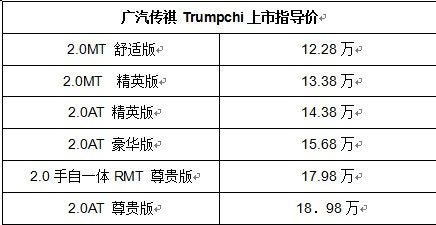 有媒體評論,廣汽傳祺Trumpchi上市發(fā)布會無論是地點的選擇、嘉賓的人數(shù)還是現(xiàn)場氣勢的營造,都創(chuàng)下了業(yè)界的多個第一,堪稱國內(nèi)有史以來規(guī)模最宏大的新車上市儀式。而12.28萬——18.98萬元極具競爭力的定價,輔以完善的“加分服務(wù)”,使得廣汽傳祺Trumpchi一上市便成為中高級轎車陣營2.0L級別最具性價比優(yōu)勢的車型?梢灶A(yù)見的是,依托廣汽集團強大的品牌號召力和品質(zhì)口碑,廣汽傳祺Trumpchi必將一炮而紅,成為中高級轎車市場的全新標桿。