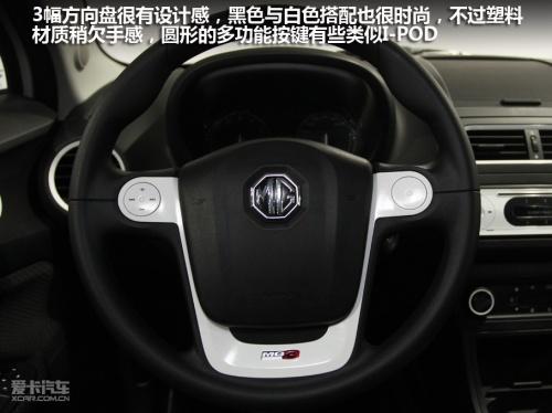 MG3的三幅方向盤設(shè)計非常出色,黑白顏色搭配十分年輕,只是采用硬質(zhì)塑料材質(zhì)手感欠佳。圓盤形的多功能按鈕與蘋果I-POD音樂播放器十分相似,正是當(dāng)下年輕人最喜愛的設(shè)計風(fēng)格。相比之下儀表的設(shè)計稍顯普通,液晶顯示面板的面積也比較小。