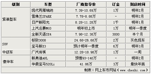 本屆廣州車展上市新車并不比北京車展多,但是所上車型基本都屬于重量級(jí)產(chǎn)品。據(jù)各廠家經(jīng)銷商銷售人員表示,十款新車大部分目前都已經(jīng)開始接受預(yù)定,并且提車時(shí)間也都集中在2011年初的第一季度,相信喜歡這些車型的朋友們?nèi)绻鍪值脑,現(xiàn)在就可以進(jìn)行預(yù)定了。