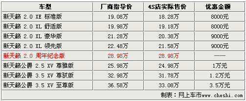 2009年6月16日,東風(fēng)日產(chǎn)推出了新天籟周年紀(jì)念版車型,售價為28.98萬。這款新車是在天籟2.5L車型的基礎(chǔ)上,增加了BOSE5.1ch環(huán)繞音響系統(tǒng)和超大型雙層全景天窗等舒適性配置,大大提升了這款車的性價比。近日,記者在走訪北京地區(qū)的東風(fēng)日產(chǎn)4S店時了解到:目前新天籟周年紀(jì)念版還沒有現(xiàn)車到店,目前預(yù)定的消費者將在7月底提到現(xiàn)車。