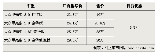 據(jù)4S店銷售人員介紹:目前甲殼蟲全系可優(yōu)惠3.5萬元,2.0標(biāo)準(zhǔn)版售價僅為19萬,但目前硬頂版甲殼蟲無現(xiàn)車,訂車需等半個月至兩個月。敞篷版目前現(xiàn)車較充足,喜歡的朋友可以不必等待漫長的訂車時間。