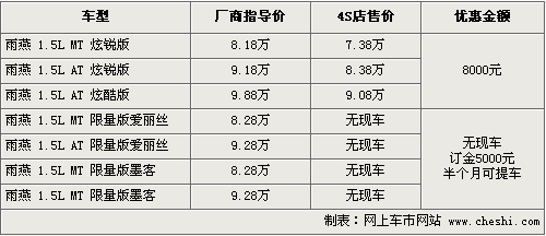 長安鈴木雨燕是小型車型中最受歡迎的一款之一,在推出限量版車型后,雨燕從整車的外觀和內飾的風格上更具個性化,時尚化,滿足了都市年輕80后的喜愛。根據(jù)網(wǎng)上車市價格監(jiān)測系統(tǒng)顯示,目前雨燕全系最高能優(yōu)惠現(xiàn)金8000元,限量版車型則需要預訂,具體車型以及價格如下: