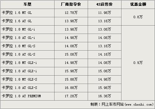 卡羅拉是一汽豐田于旗下的主力經(jīng)濟(jì)型轎車,上市后憑借著時尚的外觀贏得了消費(fèi)者的喜愛?_拉全系共有5款車型,排量分為1.6L、1.8L,價格區(qū)間為13.28萬元-17.98萬元。前段時間,豐田官方對卡羅拉全系下調(diào)了廠商指導(dǎo)價,最高下降了9000元。近日根據(jù)網(wǎng)上車市價格監(jiān)測系統(tǒng)顯示,近期在經(jīng)銷店購買卡羅拉車型的消費(fèi)者,可以得到最高9000元的優(yōu)惠,具體詳情請看下表: