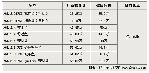 據(jù)4S店銷售人員介紹:目前奧迪A6L車系全部打9.45折,售價在35.2萬至61.4萬之間。但2.0TFSI基本型與3.0TFSI豪華型無車,也不接受預(yù)訂。車身顏色方面,黑色是A6L的主打色,同樣顏色也較齊全,除了上兩款車型無車外,其它車型現(xiàn)車充足。