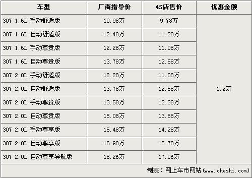 2007年9月22日,全新一代的東風(fēng)標(biāo)致307在眾多消費(fèi)者的熱切期盼中新悅登場。新東風(fēng)標(biāo)致307全系多達(dá)九種顏色共十三款車型,價格從10.98萬元--16.58萬元。近日根據(jù)網(wǎng)上車市價格監(jiān)測系統(tǒng)顯示,現(xiàn)在三廂標(biāo)致307全系優(yōu)惠1.2萬元,具體車型以及價格如下: