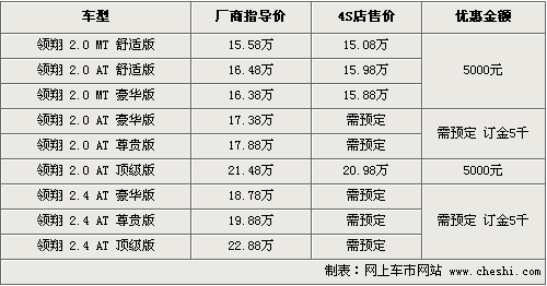 筆者從北京地區(qū)經(jīng)銷商處了解到,目前領(lǐng)翔全系優(yōu)惠幅度仍然保持在5000元。據(jù)店內(nèi)銷售人員介紹,除2.0舒適型和豪華型有部分現(xiàn)車供應(yīng)外,其他款仍需要預訂,訂金為5000元,15個工作日內(nèi)便可以交車。目前銷售的領(lǐng)翔在原來車型基礎(chǔ)上增加了2.0自動舒適與2.0手動豪華兩款車,并在配置上有一定調(diào)整。消費者可到店內(nèi)試駕體驗,了解詳細車型情況。