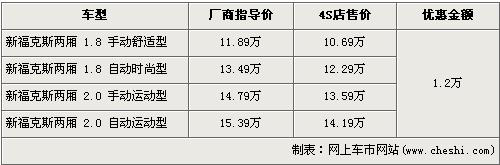 據(jù)長安福特經(jīng)銷商處銷售人員介紹,目前購買兩廂?怂沟南M者可以得到1.2萬元的優(yōu)惠。兩廂新款?怂狗譃1.8L和2.0L兩種排量,入門級車型的1.8L手動舒適版經(jīng)優(yōu)惠后售價下降到了10.69萬元。而高配的2.0L自動運動版售價同樣也降到了14.19萬元。