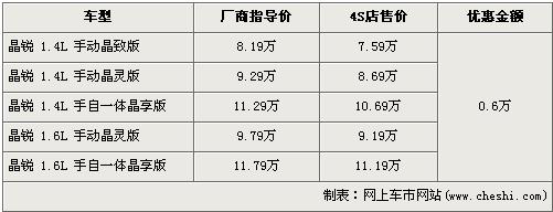 據(jù)記者走訪北京多家斯柯達(dá)經(jīng)銷店獲知,近期購買斯柯達(dá)晶銳的消費者可以得到全系6000元的優(yōu)惠。經(jīng)優(yōu)惠后,入門級的斯柯達(dá)晶銳1.4L手動晶致版售價從8.19萬元下降到了7.59萬元。頂配的1.6L手自一體晶享版售價從11.79萬元降到了11.19萬元。
