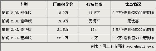 據(jù)北京克萊斯勒4s店銷(xiāo)售人員介紹,克萊斯勒鉑銳已經(jīng)停止進(jìn)口,除了2.0L 豪華版已沒(méi)有庫(kù)存車(chē)外,經(jīng)銷(xiāo)店內(nèi)還剩部分其他車(chē)型庫(kù)存車(chē)。經(jīng)7000元優(yōu)惠后,2.0L舒適版的售價(jià)從18.2萬(wàn)元下降到了17.5萬(wàn)元。2.4L豪華版經(jīng)2.5萬(wàn)元優(yōu)惠后,售價(jià)降到了19萬(wàn)元。全系最高配的2.7L豪華版經(jīng)2.7萬(wàn)元優(yōu)惠后,售價(jià)下降到了20萬(wàn)元。購(gòu)買(mǎi)鉑銳的消費(fèi)者在得到現(xiàn)金優(yōu)惠的同時(shí),還可以得到價(jià)值5000元的內(nèi)部裝飾。