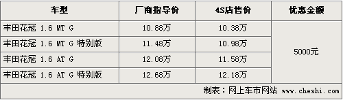 國產(chǎn)花冠已經(jīng)是其第九代產(chǎn)品,尤其值得稱道的是其VVT-i發(fā)動機(jī),這是豐田國產(chǎn)車型中首款采用此發(fā)動機(jī)的車型。國產(chǎn)后這款車的表現(xiàn)依然如日中天,成為一汽豐田的看家產(chǎn)品。根據(jù)網(wǎng)上車市價格監(jiān)測系統(tǒng)顯示,目前花冠全系車型出現(xiàn)了5000元的優(yōu)惠幅度,具體車型以及優(yōu)惠如下:
