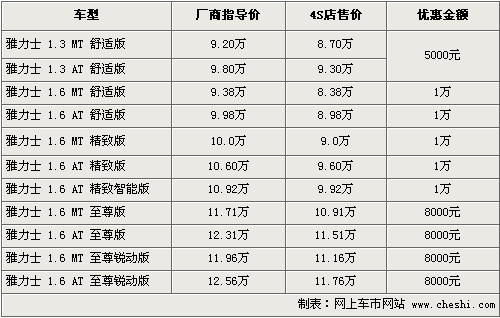據(jù)4S店銷售人員介紹,目前雅力士全系車型有黑色、紫色等現(xiàn)車供應(yīng)。因?yàn)檐囆洼^多,現(xiàn)車主要集中在1.3、1.6舒適版手動(dòng)和自動(dòng)擋車型上,其余高配車型均需要預(yù)訂,F(xiàn)金優(yōu)惠方面1.3排量?jī)煽钴嚳梢詢?yōu)惠現(xiàn)金5000元,1.6精致版優(yōu)惠則達(dá)到了1萬元,最低售價(jià)僅為8.38萬元。至尊版車型優(yōu)惠8000元現(xiàn)金,如果消費(fèi)者到店的話還將有一部分的優(yōu)惠。