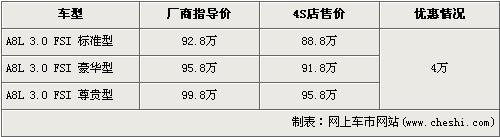 據(jù)北京奧迪經(jīng)銷店銷售人員介紹,目前奧迪A8L的3.0L車型有4萬元的優(yōu)惠。經(jīng)優(yōu)惠后,3.0L標(biāo)準(zhǔn)型的售價(jià)從92.8萬下降到了88.8萬元,3.0L豪華型的售價(jià)從95.8萬元下降到了91.8萬元,3.0L尊貴型的售價(jià)也從99.8萬元下降到了95.8萬元。銷售人員還介紹,店內(nèi)目前沒有現(xiàn)車,欲購買的消費(fèi)者需交2萬元訂金,本月月底可提車。