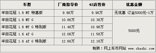 據(jù)4S店銷售人員介紹,花冠特惠版車型在配置方面比現(xiàn)在標(biāo)準(zhǔn)版有所減少,其中包括減少了遙控鑰匙、前進(jìn)氣格柵的鍍鉻裝飾條,揚(yáng)聲器由4個減少為2個,其他方面并沒有明顯變化,F(xiàn)在這款車定金為5000元-1萬元,最快月底到店,10月份將全面到店。同時現(xiàn)售的車型價(jià)格方面可以優(yōu)惠5000元現(xiàn)金,但現(xiàn)車數(shù)量不多,仍需要預(yù)訂。