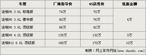 途銳是大眾首款引進我國的SUV車型,在3.6L及4.2L率先上市后,大眾為了滿足消費者的更大胃口,緊接著又推出了搭載12缸發(fā)動機的6.0L車型。隨著大排量消費稅的頒布,給9月份后入關的大排量車型帶來了一次不小的沖擊,令大排量汽車價格都上調(diào)了不少,大眾途銳6.0L頂級版也從原來158萬元的價格上調(diào)至了180元。近日據(jù)網(wǎng)上車市價格系統(tǒng)監(jiān)測顯示,大眾途銳全系的最高優(yōu)惠達到了10萬元,具體詳情請看下表: