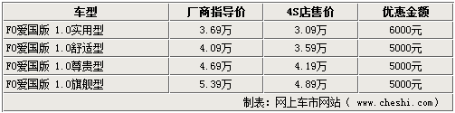 據(jù)比亞迪汽車4S店銷售人員介紹,比亞迪F0愛(ài)國(guó)版igo系列車型的現(xiàn)車并不是很齊全,實(shí)用型和舒適型都有現(xiàn)車,尊貴型和旗艦型則需要預(yù)訂,大概10-15天即可提車。而目前1.0L實(shí)用型和舒適型都有現(xiàn)車,其中實(shí)用型可以優(yōu)惠6000元,優(yōu)惠后售價(jià)已經(jīng)接近3萬(wàn);而其他車型只可以優(yōu)惠5000元現(xiàn)金。