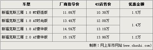 據(jù)4S店銷售人員介紹:目前福克斯三廂1.8升三款車型現(xiàn)車充足,尤其銀色、灰色、藍色、黑色車型現(xiàn)車較多,手動擋車型目前優(yōu)惠1.5萬元,優(yōu)惠后僅售10.39萬元,1.8升自動版車型優(yōu)惠1.4萬元。2.0升車型目前現(xiàn)車較少,顏色也不齊全,訂車需等待3周左右,目前優(yōu)惠1.2萬元。