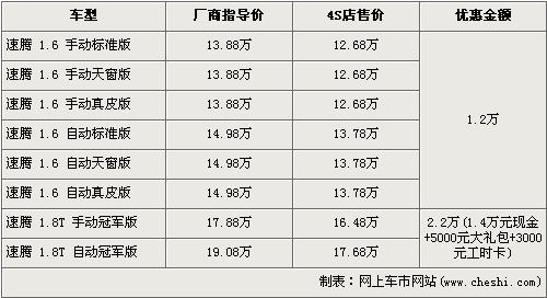 速騰是一汽大眾在緊湊型市場(chǎng)中的主打車型,全系車型涵蓋了1.6L、18T、2.0L三個(gè)“黃金”排量,并且在今年又會(huì)有替代2.0L車型上市的1.4T車型加入車隊(duì)中,車型列隊(duì)得到了進(jìn)一步強(qiáng)大。近日根據(jù)網(wǎng)上車市價(jià)格系統(tǒng)監(jiān)測(cè)顯示,速騰的1.8T冠軍版出現(xiàn)了全系最高的價(jià)值2.2萬元的優(yōu)惠,具體價(jià)格詳情請(qǐng)看下表: