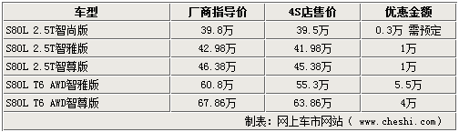 據(jù)4S店銷(xiāo)售人員介紹,目前國(guó)產(chǎn)S80L全系智尚版沒(méi)有現(xiàn)車(chē)供應(yīng),需要消費(fèi)者訂車(chē),訂金為5萬(wàn)元。除優(yōu)惠5.5萬(wàn)的T6智雅版外,其它幾款車(chē)也可以分別優(yōu)惠1萬(wàn)到4萬(wàn)元不等,到店詳談還可以有更多的優(yōu)惠。