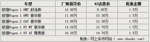 據(jù)銷售人員介紹,雖然兩款增壓版駿捷Wagon車型經(jīng)官方調(diào)價(jià),但各店內(nèi)銷售的駿捷WAGON車型仍可給出1.5萬元的現(xiàn)金優(yōu)惠,還是相當(dāng)超值的,F(xiàn)階段店內(nèi)在售的主要為1.8L的手動(dòng)版車型,而2.0L車型較少,如需購買仍需提前預(yù)訂,訂金為5000元,一個(gè)月左右的時(shí)間即可提車。