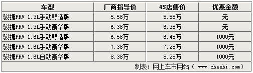 駿捷FRV是中華汽車首款兩廂車型,涵蓋排量由1.6L至1.3L的多款車型,全系車型分別在去年5月份和7月份上市,售價(jià)區(qū)間為5.58萬(wàn)元至8.38萬(wàn)元。網(wǎng)上車市網(wǎng)站近期了解到,一直處在預(yù)訂銷售狀態(tài)的1.3L車型已經(jīng)到店,而店內(nèi)的1.6L駿捷FRV全系優(yōu)惠1000元。詳情如下: