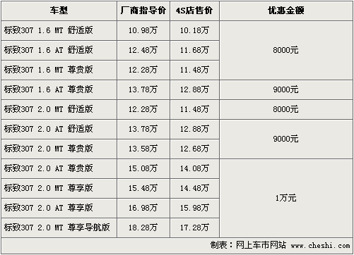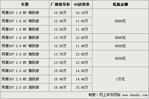 東風標致旗下的“大嘴”307,自在08年上市至今得到了消費者的一直認可和喜愛。根據網上車市價格監(jiān)測系統(tǒng)顯示,東風標致將于9月17日正式推出新款標致307,同時老款優(yōu)惠幅度進一步加大。具體車型以及價格如下:
