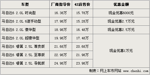 全新馬自達6睿翼在4月份正式上市,在繼承了馬自達6老款車風(fēng)格同時,睿翼在外觀和內(nèi)飾上帶給消費者耳目一新的感覺。與此同時,老款的馬自達6與睿翼同時銷售,兩款車的價位區(qū)間覆蓋從17萬-25萬,為消費者購車提供了較大的選擇空間。根據(jù)網(wǎng)上車市價格監(jiān)測系統(tǒng)顯示,目前睿翼全系優(yōu)惠幅度加大,老款馬6最高優(yōu)惠2.7萬元。具體行情如下: