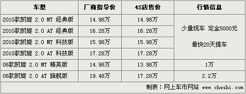 據(jù)東風(fēng)雪鐵龍銷售人員介紹,2010款凱旋目前沒有任何優(yōu)惠,車型顏色也不太齊全,預(yù)訂訂金為5000元,最快20天可提車。另外08款凱旋還有少量現(xiàn)車低價(jià)甩貨,最高優(yōu)惠幅度為2.2萬元左右,顏色以黑色、銀色為主。北京地區(qū)各4S店由于訂單不同,各店銷售的現(xiàn)車顏色有所不同。