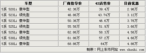 據4S店銷售人員介紹:目前寶馬5系最高優(yōu)惠4.86萬元,部分車型有現車。520Li領先型由于銷量不好,所以暫時停產,目前2.0排量車型只有520Li豪華型。523Li系列車型只有523Li豪華型有現車,但顏色不全只有銀色黑內飾車款,如預定523Li領先型需等1-2個月時間。525Li系列豪華型有現車,顏色為銀色、白色及灰色,525Li領先型車款預訂需等1個月時間。530Li領先型有金色、銀色現車,530Li豪華型有灰色現車。目前最高優(yōu)惠可達4.86萬元,優(yōu)惠幅度較大。