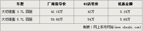 據(jù)經(jīng)銷商銷售人員介紹,大切諾基3.7L車型的優(yōu)惠金額僅為1900元,而高排量的5.7L車型優(yōu)惠金額達(dá)到了5.69萬元,達(dá)到了全系的最高。在售的Jeep-大切諾基共分為3.7L四驅(qū)和5.7L四驅(qū)兩個(gè)車型。3.7L四驅(qū)型經(jīng)1900元優(yōu)惠后,售價(jià)降為了42萬元。而排量稍大的5.7L四驅(qū)型經(jīng)5.69萬元優(yōu)惠后,售價(jià)降為了54萬元。