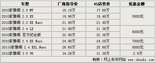 雅閣一直是中級(jí)車市場(chǎng)最受矚目的車型之一,棱角分明的外觀以及舒適的內(nèi)飾空間以及豪華程度成為眾多商務(wù)人士最佳選擇。廣州本田在推出2010款車型后,使雅閣整車的性價(jià)比進(jìn)一步提升。據(jù)網(wǎng)上車市價(jià)格監(jiān)測(cè)系統(tǒng)顯示:目前雅閣的優(yōu)惠幅度有所降低,最高優(yōu)惠2.9萬元。具體車型行情如下: