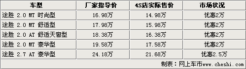 北京現(xiàn)代途勝是韓系車(chē)中非常經(jīng)典的一款城市型SUV,寬大的空間,時(shí)尚的外觀以及人性化的配置使眾多消費(fèi)者都鐘情它,從上市到現(xiàn)在在SUV市場(chǎng)中一直有著不錯(cuò)的銷(xiāo)量。近日根據(jù)網(wǎng)上車(chē)市價(jià)格監(jiān)測(cè)系統(tǒng)顯示,目前購(gòu)買(mǎi)現(xiàn)代途勝車(chē)型最高可以得到2.5萬(wàn)的現(xiàn)金優(yōu)惠。具體車(chē)型見(jiàn)下表: