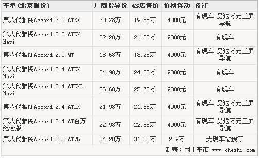 據(jù)廣汽本田4S店銷(xiāo)售人員介紹,目前雅閣全系現(xiàn)車(chē)供應(yīng)較為充足,顏色方面也比較齊全。3.5排量最高可優(yōu)惠近3萬(wàn)元,但該車(chē)為訂單式銷(xiāo)售需預(yù)訂。2.0及2.4排量車(chē)型的優(yōu)惠幅度較小,無(wú)導(dǎo)航車(chē)型可優(yōu)惠4000元,另贈(zèng)送價(jià)值萬(wàn)元全車(chē)三屏導(dǎo)航。已帶有導(dǎo)航的車(chē)型可直接優(yōu)惠9000元。北京地區(qū)各4S店由于訂單不同,各店銷(xiāo)售的現(xiàn)車(chē)顏色有所不同,預(yù)購(gòu)雅閣的消費(fèi)者可到店詳談,在價(jià)格上還會(huì)有進(jìn)一步的優(yōu)惠。