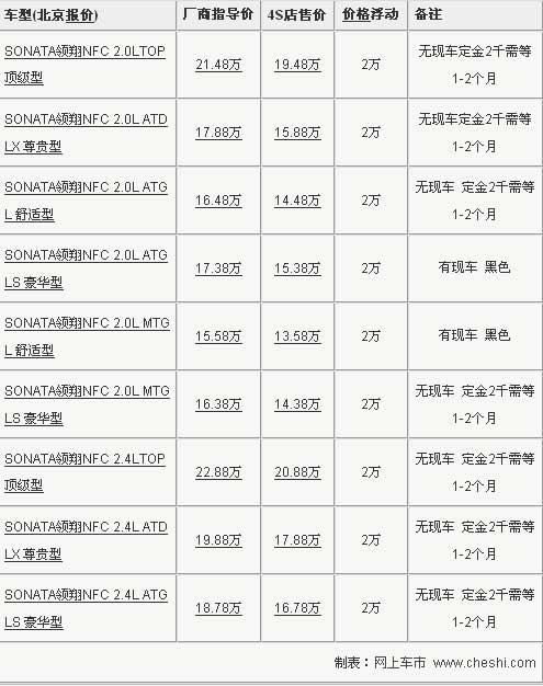 作為SONATA御翔的換代車型-----北京現(xiàn)代索納塔領(lǐng)翔于08年底正式上市銷售,是結(jié)合了韓國(guó)現(xiàn)代最先進(jìn)的造車技術(shù),憑借著大氣穩(wěn)重外形,寬大空間,乘坐性高,強(qiáng)勁動(dòng)力等較高的綜合性價(jià)比屹立于中級(jí)車之林。根據(jù)網(wǎng)上車市價(jià)格監(jiān)測(cè)系統(tǒng)顯示,目前領(lǐng)翔全系現(xiàn)金優(yōu)惠2萬元,現(xiàn)車不全,具體車型需預(yù)定,具體行情如下: