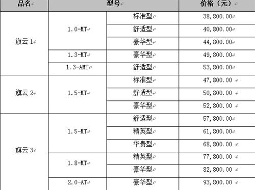 整合后的旗云品牌將面對(duì)大眾消費(fèi)者,以“務(wù)實(shí)、家庭、信賴”為品牌內(nèi)涵,為消費(fèi)者提供可以輕松擁有、值得信賴的汽車產(chǎn)品,現(xiàn)階段主要包括旗云1、旗云2和旗云3三款產(chǎn)品,分別在A0級(jí)、A級(jí)、A+級(jí)三大市場中豎立“空間、節(jié)能、性價(jià)比”新標(biāo)桿。同時(shí)在未來,旗云品牌將進(jìn)一步豐富產(chǎn)品線和品牌內(nèi)涵,從而滿足國內(nèi)汽車市場差異化的需求。