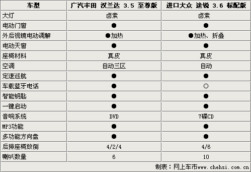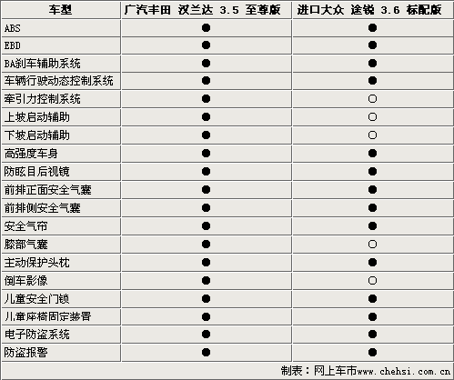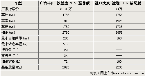 2009年5月25日,廣汽豐田的首款SUV車型漢蘭達(dá)正式下線,并宣布其正式上市。國產(chǎn)漢蘭達(dá)車型分為2.7和3.5兩個(gè)排量,共計(jì)10款車型,售價(jià)為24.88萬元-42.98萬元。漢蘭達(dá)在外型設(shè)計(jì)上突破了傳統(tǒng)的SUV設(shè)計(jì)風(fēng)格的束縛,注重內(nèi)在的力量而非粗放的外表,在堅(jiān)韌的軀殼之上更追求智能化,同時(shí)它也是豐田在中國地區(qū)投產(chǎn)的首款中級城市SUV車型。那么它的市場競爭力究竟如何?和市場上其它中級城市SUV車型相比究竟有那些優(yōu)勢呢?為了能讓您可以更加清楚地了解這款新車,我們選擇了市場銷售的進(jìn)口大眾途銳與其來做一個(gè)全方位的對比。這兩款車型無論從車身尺寸,還是動(dòng)力系統(tǒng)均屬于一個(gè)級別的SUV車型。