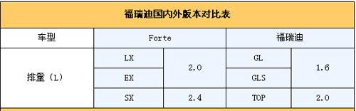 總結:從上面的對比我們發(fā)現,Forte國內外兩種版本之間的差異還是很大的,其中動力單元差別最顯著,這主要是由國情和消費能力所決定的。目前國內市場上小排量車型大行其道,尤其是1.6L車型更是炙手可熱,福瑞迪今后的重點也將會落在1.6L車型上,至于2.0L車型更多的將擔負起拉升品牌形象的重任。具體價格車型配置等信息,我們將在上市第一時間為你詳細報道,敬請大家關注!