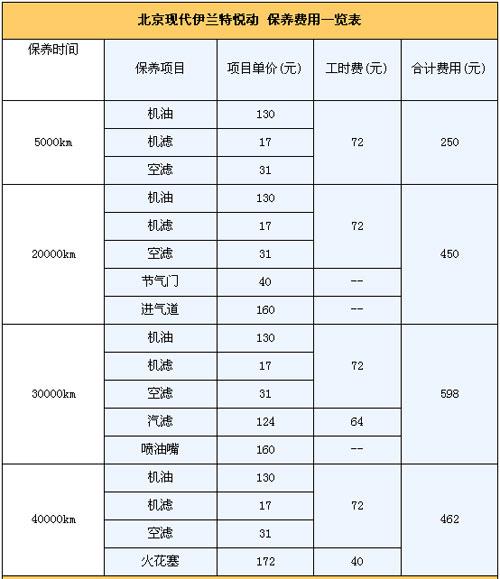 4.保養(yǎng)費:悅動的首保為5000km,以后每次的保養(yǎng)間隔為5000km。保修政策為2年/6萬公里保修(以先到為準)。第二次的10000km保養(yǎng)和首保內(nèi)容相同。那么如果一年行駛2萬km,悅動一年要做四次保養(yǎng)。由下表可知其除了第一年,以后每年的保養(yǎng)費用1500元。