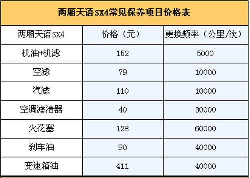 4.保養(yǎng)費(fèi):我們向長(zhǎng)安鈴木4S店售后服務(wù)人員咨詢過,廠家規(guī)定天語SX4的首保時(shí)間為兩個(gè)月或者1500~2500公里(以先到為準(zhǔn)),正常保養(yǎng)周期為5000公里,假設(shè)一年跑2萬公里,一年則需要做保養(yǎng)4次。第一次常規(guī)保養(yǎng)(只更換機(jī)油機(jī)濾,首保免費(fèi))費(fèi)用為152元;第二次(更換機(jī)油機(jī)濾+空氣濾芯+汽油濾芯)為341元;第三次常規(guī)保養(yǎng)(更換機(jī)油機(jī)濾)152元;第四次(更換機(jī)油機(jī)濾+空氣濾芯+汽油濾芯+變速箱油)為411元,此外空調(diào)濾芯3萬公里更換,剎車油4萬公里更換,那么2年/4萬公里的保養(yǎng)費(fèi)用為2242元,平均一年兩萬公里需花費(fèi)為1121元左右。