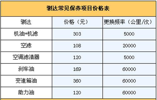 4.保養(yǎng)費:我們向東風日產4S店售后服務人員咨詢過,騏達常規(guī)保養(yǎng)周期定為每5000公里一次,首保在購車后行駛1000km或一個月進行(以先達到者為限),二保5000公里時進行,前兩次保養(yǎng)免費。假設一年跑2萬公里,則需要做保養(yǎng)四次。前三次都為常規(guī)保養(yǎng)(只更換機油機濾),一次303元、一次379元交替進行。第四次保養(yǎng)(更換機油機濾+空濾+空調濾芯)為637元;如此一個周期往復。另外4萬公里保養(yǎng)時需要更換剎車油和變速箱油,保養(yǎng)價格為1090元,那么2年/4萬公里總費用大概需要3318元左右,平均一年為1659元。