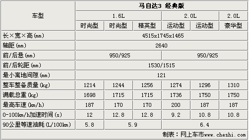 馬3經(jīng)典版全系車型的車身尺寸達到了4515 X 1745 X 1465mm;雖然這款車采用了更加運動的前臉,但是車身尺寸較老款車型并沒有變化,而且這款車的離地間隙為121mm,比較適應國內(nèi)的復雜路況。由于排量的不同,這六款車的加速時間也有所區(qū)別,其中1.6L自動擋車型的加速時間為12.8秒,2.0L手擋車型的加速時間為9.2秒。