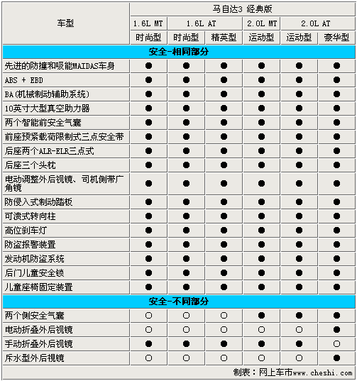 長安馬自達旗下的新款三廂轎車——馬自達3經(jīng)典版于6月21日正式上市,售價為11.28萬-14.98萬。這款分別搭載1.6L引擎和2.0L引擎的新車,由于配置和動力差異共分為6款車型。其中1.6手動時尚型和1.6自動時尚型的差價為1萬元,而低配車型和2.0自動豪華版車型的差價高達 3.7萬元,那么它們之間到底有著怎樣的配置差異呢?