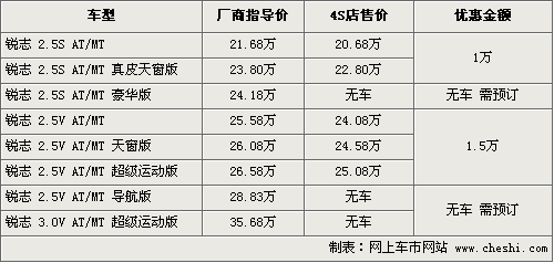 銳志的原車型是在日本廣受好評(píng)的“MARK-X”系列,國(guó)產(chǎn)后的銳志同MARK X一樣配備有2.5L和3.0L兩種排量的發(fā)動(dòng)機(jī),但取消了四驅(qū)車型,全部為前置后驅(qū),同時(shí)超長(zhǎng)的軸距設(shè)計(jì)讓乘員的空間也有了非常理想的狀態(tài)。同時(shí)也是頗受改裝車迷喜愛(ài)的一款車型,目前銳志在車款的價(jià)格上有一定幅度的優(yōu)惠,最高可優(yōu)惠1.5萬(wàn)元,具體車型和價(jià)格如下: