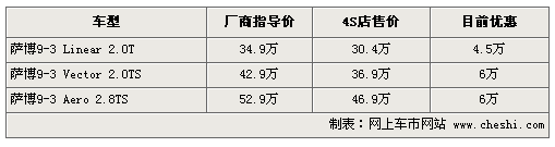 據(jù)4S店銷售人員介紹:目前薩博9-3現(xiàn)車較充足,最高優(yōu)惠可達6萬元,標(biāo)準(zhǔn)型薩博9-3目前優(yōu)惠4.5萬。如需訂購顏色較少的車,等待時間在1-2周左右。