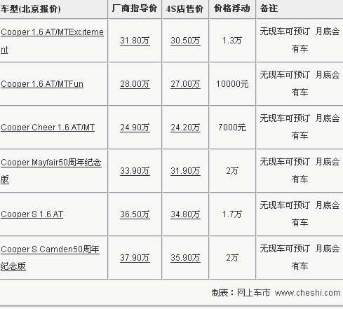 據北京MINI經銷店銷售人員介紹,目前MINI Cooper全系最高優(yōu)惠2萬元。入門級的Cheer版經過7000元優(yōu)惠后,售價從24.9萬元下降到了24.2萬元。而兩款50周年紀念版車型的2萬元優(yōu)惠達到了全系的最高,其他車型優(yōu)惠1-1.3萬元不等。