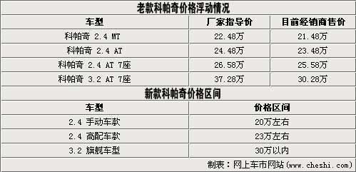 與此同時,2010年開始進口雪佛蘭科帕奇在北京市場的售價都以穩(wěn)定的優(yōu)惠幅度進行銷售。例如2.4升車型普遍優(yōu)惠一萬元,實際售價僅為21.48-25.58萬;3.2升旗艦車型為30.28萬優(yōu)惠幅度達(dá)到7萬元。那么現(xiàn)款科帕奇在優(yōu)惠后的價格區(qū)間也恰好與內(nèi)部人士透露的新款車型上市后的價位區(qū)間相近。