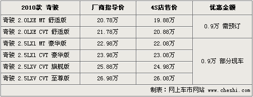 奇駿2010款新車在10月28日正式上市銷售,新款在外觀、配置等方面進行了一些列升級,但是價格并沒有做出任何調(diào)整。根據(jù)網(wǎng)上車市價格監(jiān)測顯示,目前購買2010款奇駿可享受9000元的現(xiàn)金優(yōu)惠,但低配車型現(xiàn)車緊張需預訂,具體參考如下:
