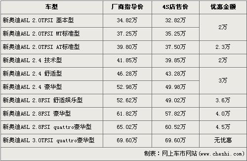 據(jù)4S店銷售人員介紹,目前奧迪A6L全系可以最高優(yōu)惠4.5萬元。奧迪A6L全系分為2.0TFSI,2.4L,2.8FSI,3.0TFSI四種共10個車型,最低配的2.0TFSI基本型經(jīng)2萬元優(yōu)惠后售價從34.82萬元下降到了32.82萬元,而2.8TSI quattro豪華版經(jīng)全系最高的4.5萬元優(yōu)惠后售價也降到了60.52萬元。全系最高配的3.0TFSI quattro豪華版目前店內(nèi)沒有現(xiàn)車,欲購買的消費者需要交1萬元訂金,約等3個月后方可提車。