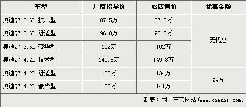 Q7是奧迪打造的第一款“高性能SUV”,同時也是奧迪引進中國的第一款頂級SUV車型。Q7憑借杰出的運動性、高超的操控性及沖擊性極強的外形在上市時就獲得了人們的關注。隨著在上海車展亮相的改款新Q7即將上市,在售的老款Q7已經(jīng)停產(chǎn)。目前在售的奧迪Q7出現(xiàn)了最高為24萬元的優(yōu)惠,具體詳情請看下表: