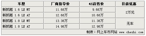 據(jù)4S店銷售人員介紹:目前新凱越分為1.6升和1.8升車型,但目前在售車型只有1.6升手動(dòng)豪華型和1.6升自動(dòng)豪華型,1.6升低配車型目前無(wú)車,1.8升由于銷量極少,所以廠家不排產(chǎn),也不接受預(yù)訂。目前1.6升車型現(xiàn)車很充足,顏色有白色、銀色、紅色、黑色等,這幾種顏色車型銷量較好。目前新凱越最高可優(yōu)惠2.2萬(wàn)元,但店內(nèi)無(wú)裝飾贈(zèng)送。